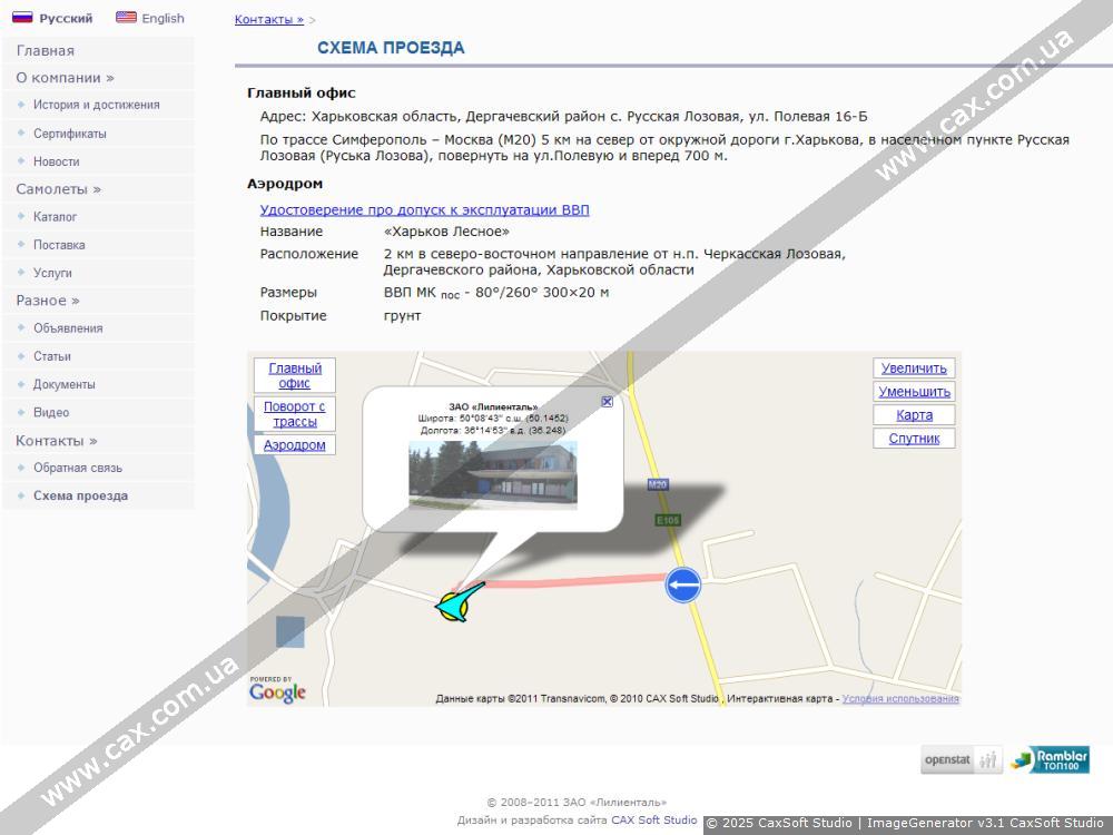 Интерактивная карта с отмеченным положением главного офиса компании и аэродрома,