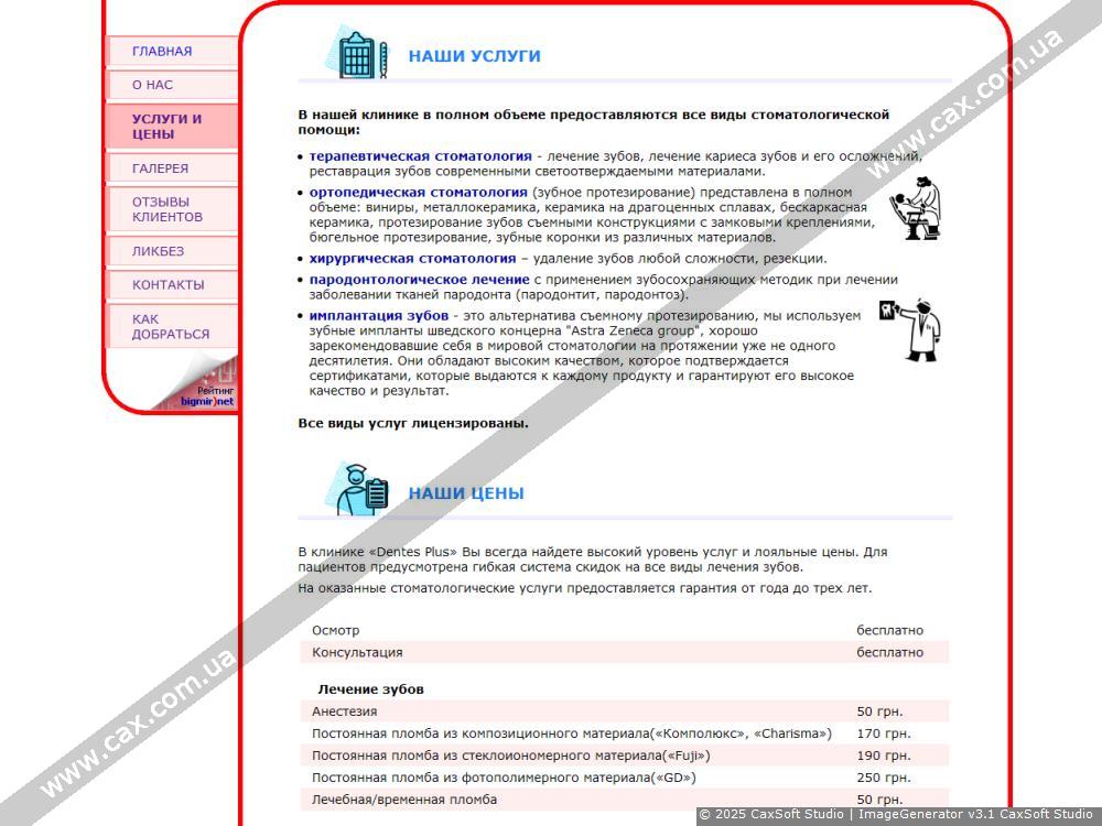 Сайт клиники «Dentes Plus» содержит полную информацию о клинике, услугах